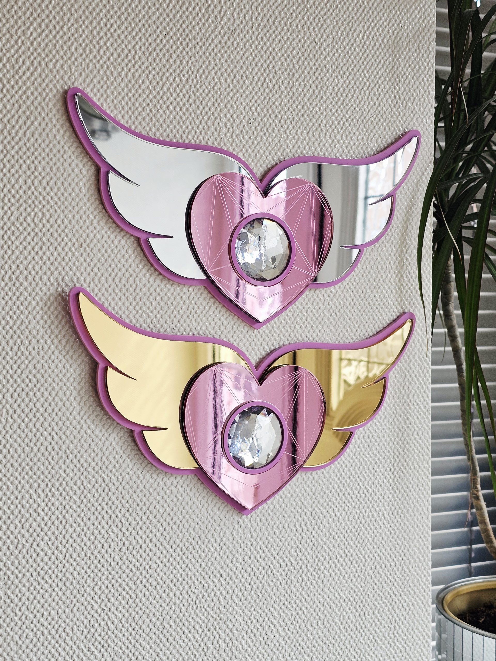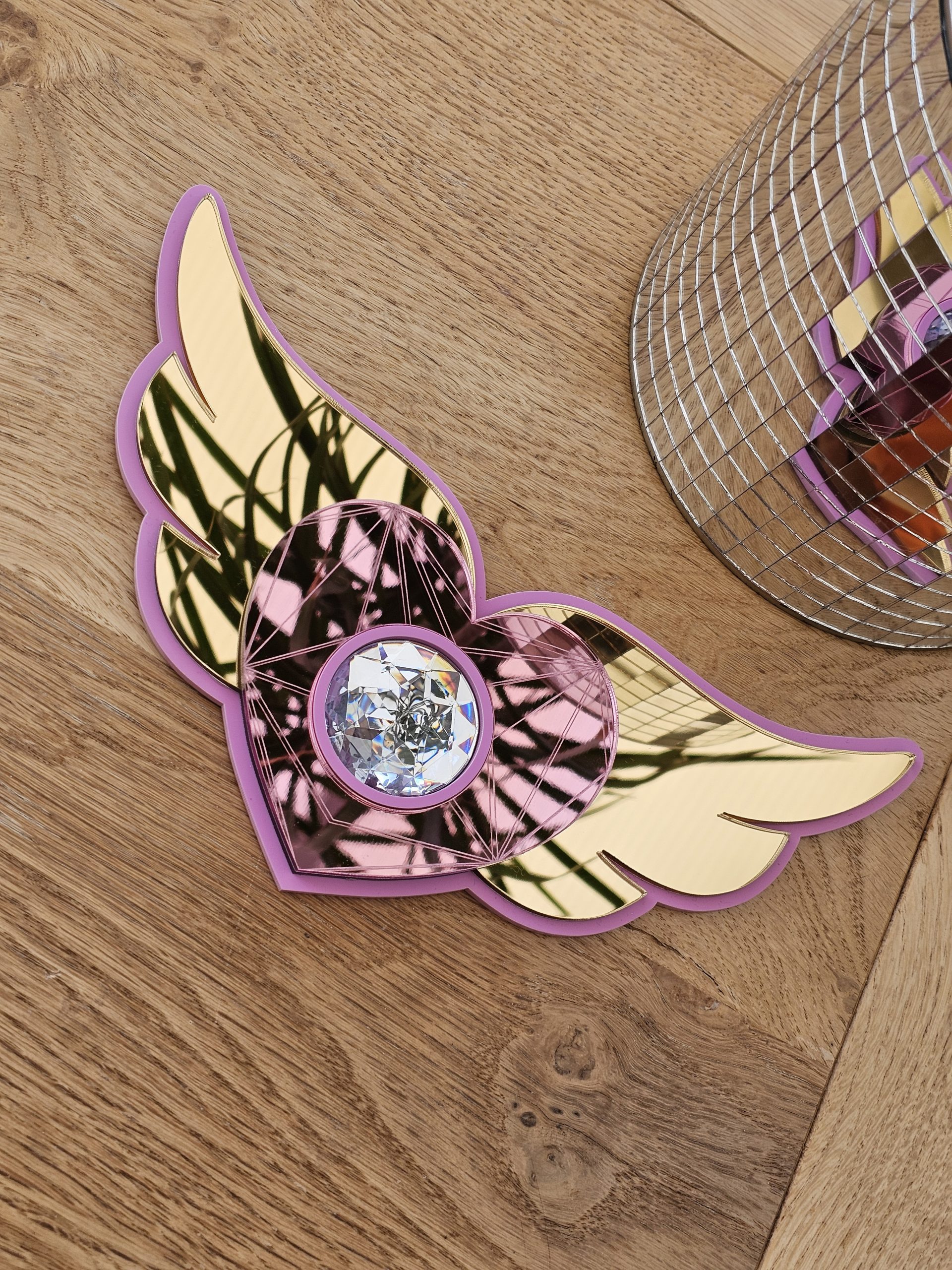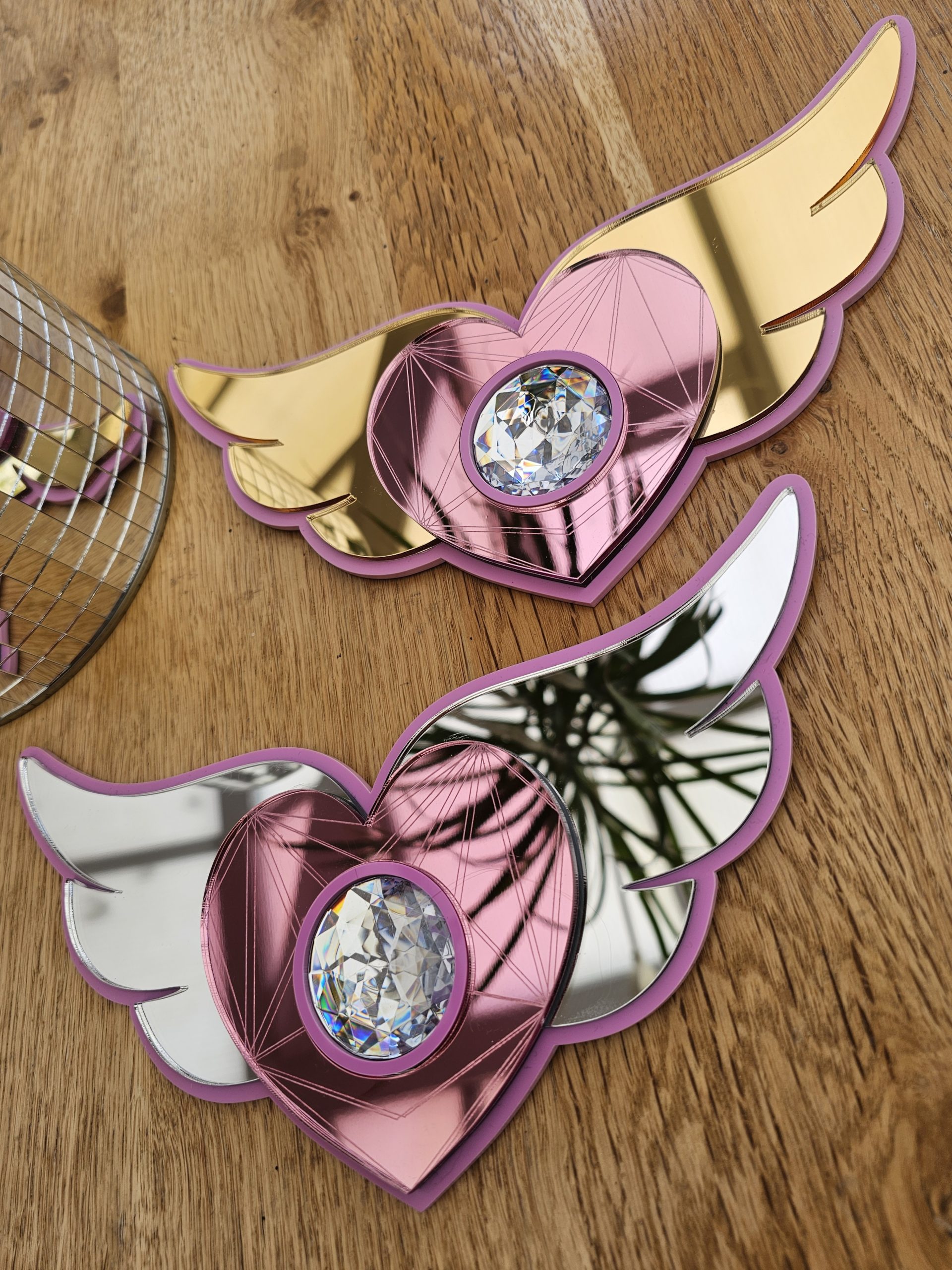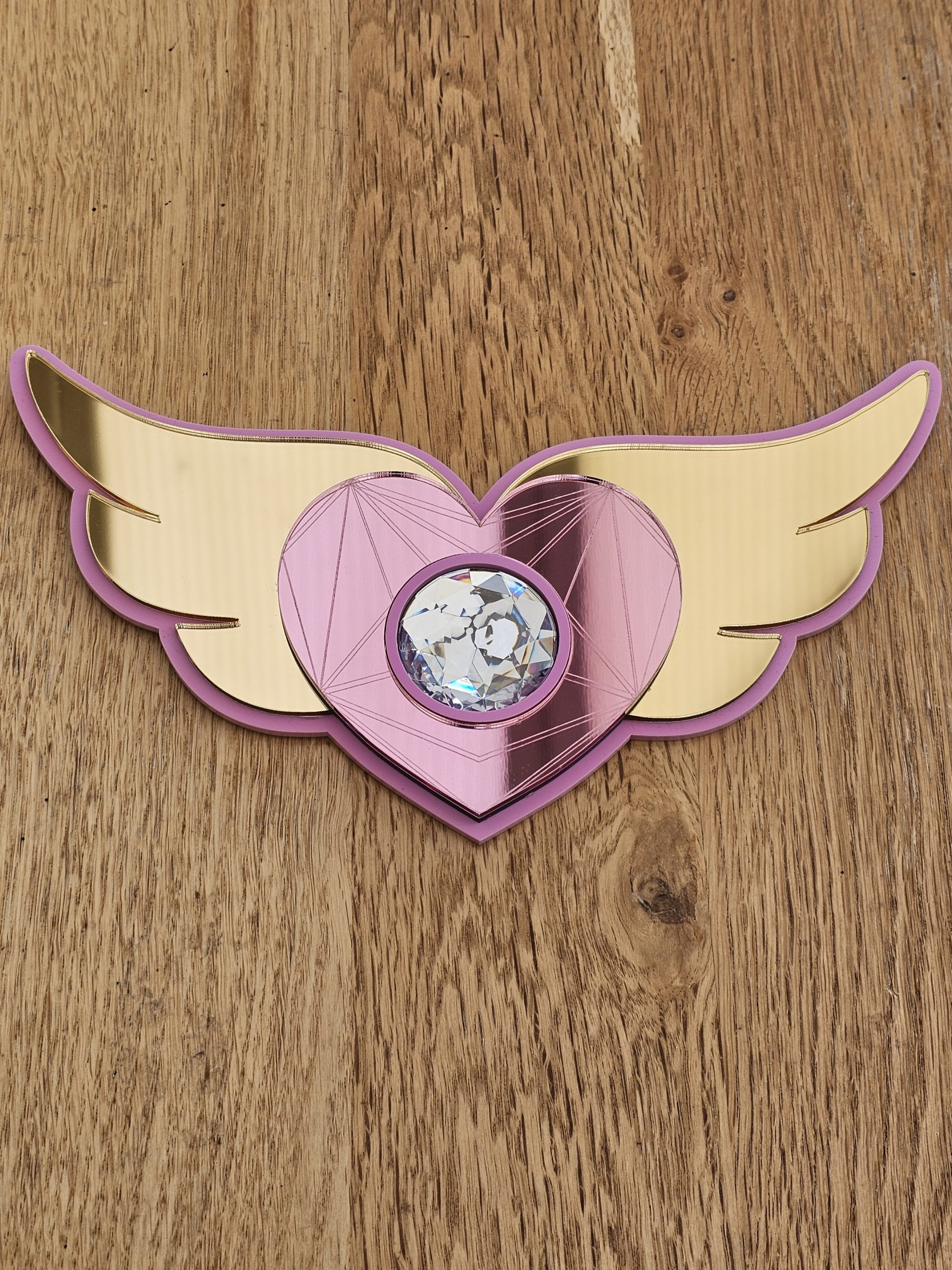 3mm thick pink acrylic backing, layered with 3mm thick gold or silver wings, pink acrylic mirror heart and resin crystal rhinestone.