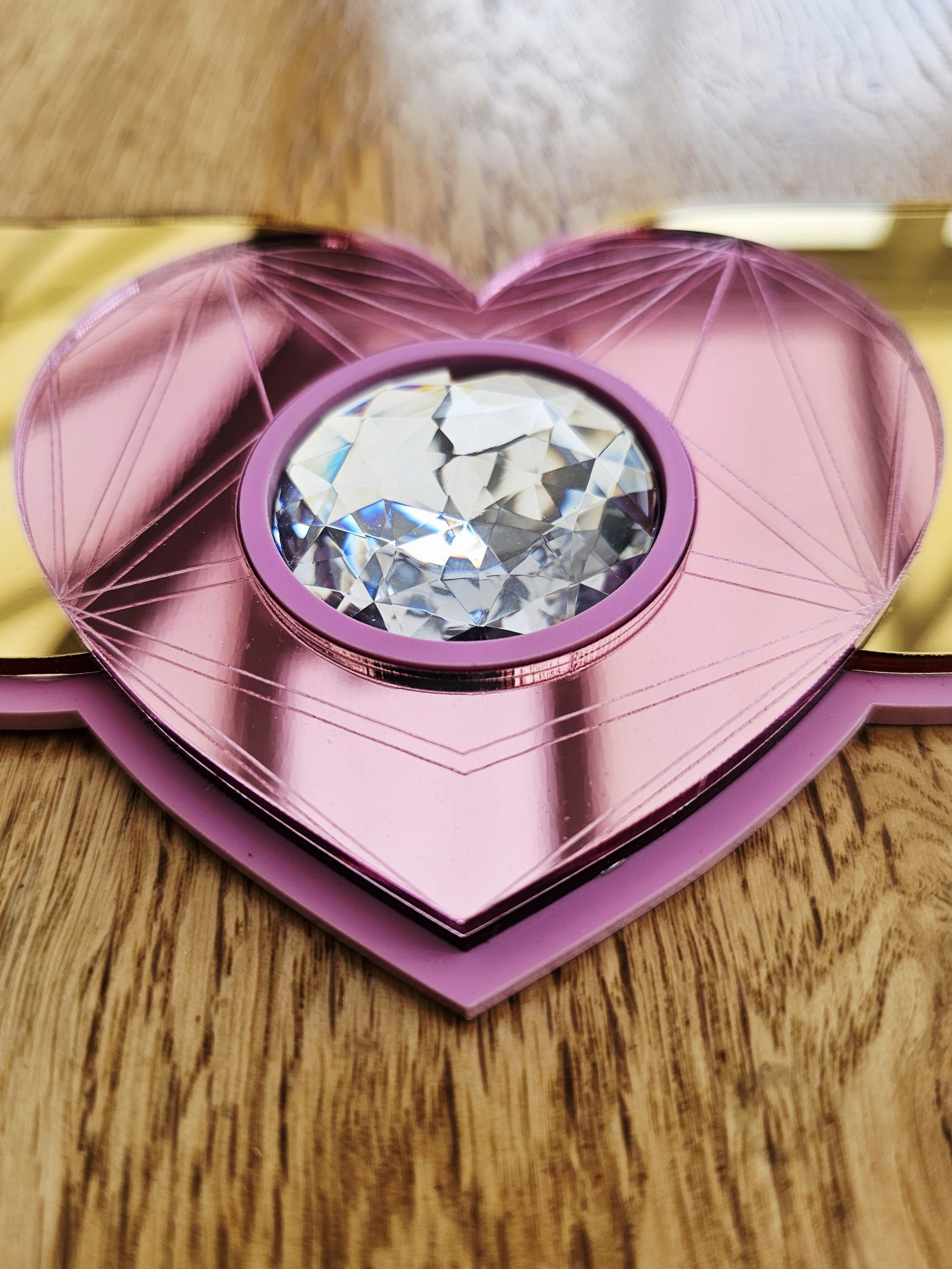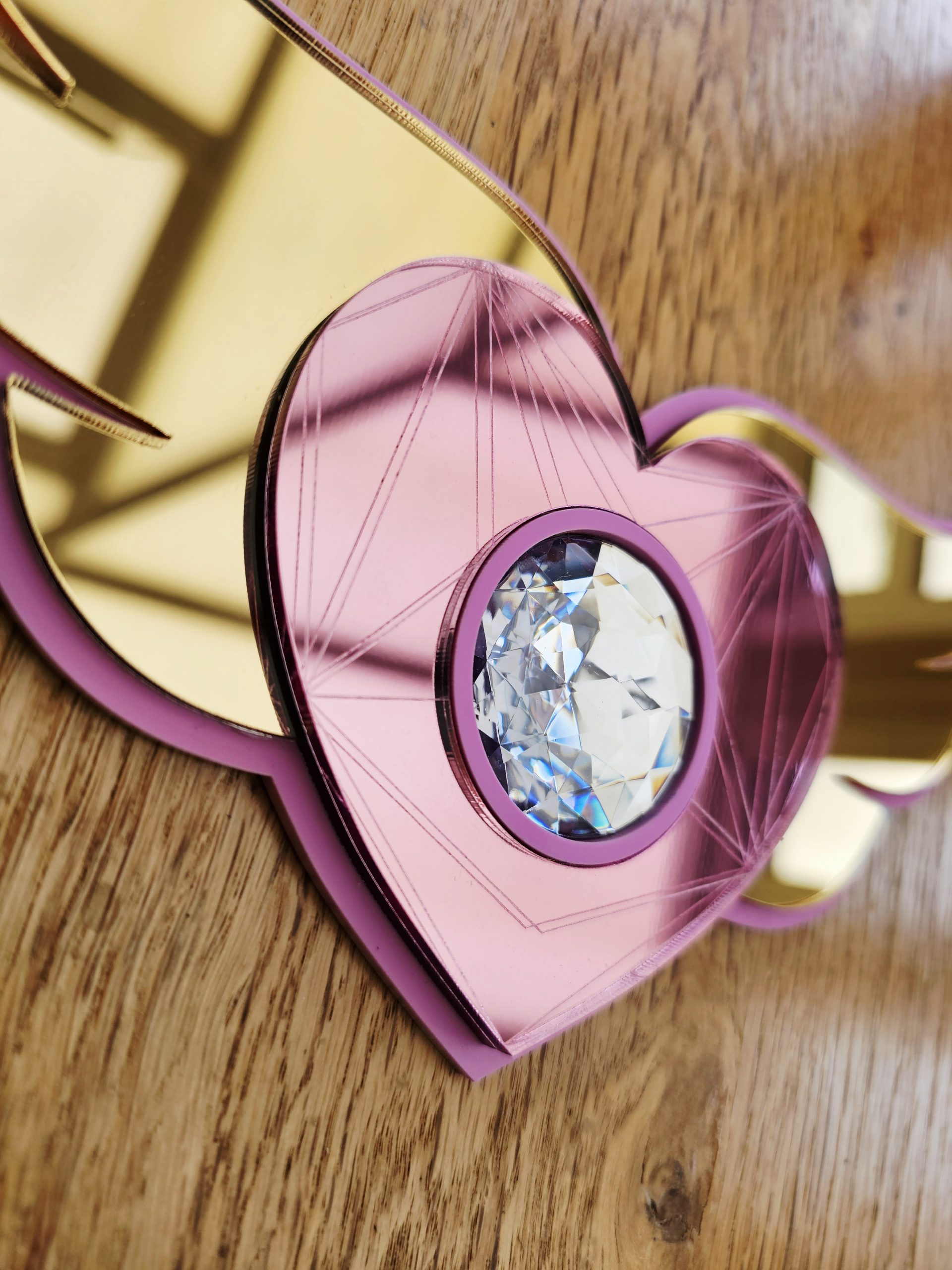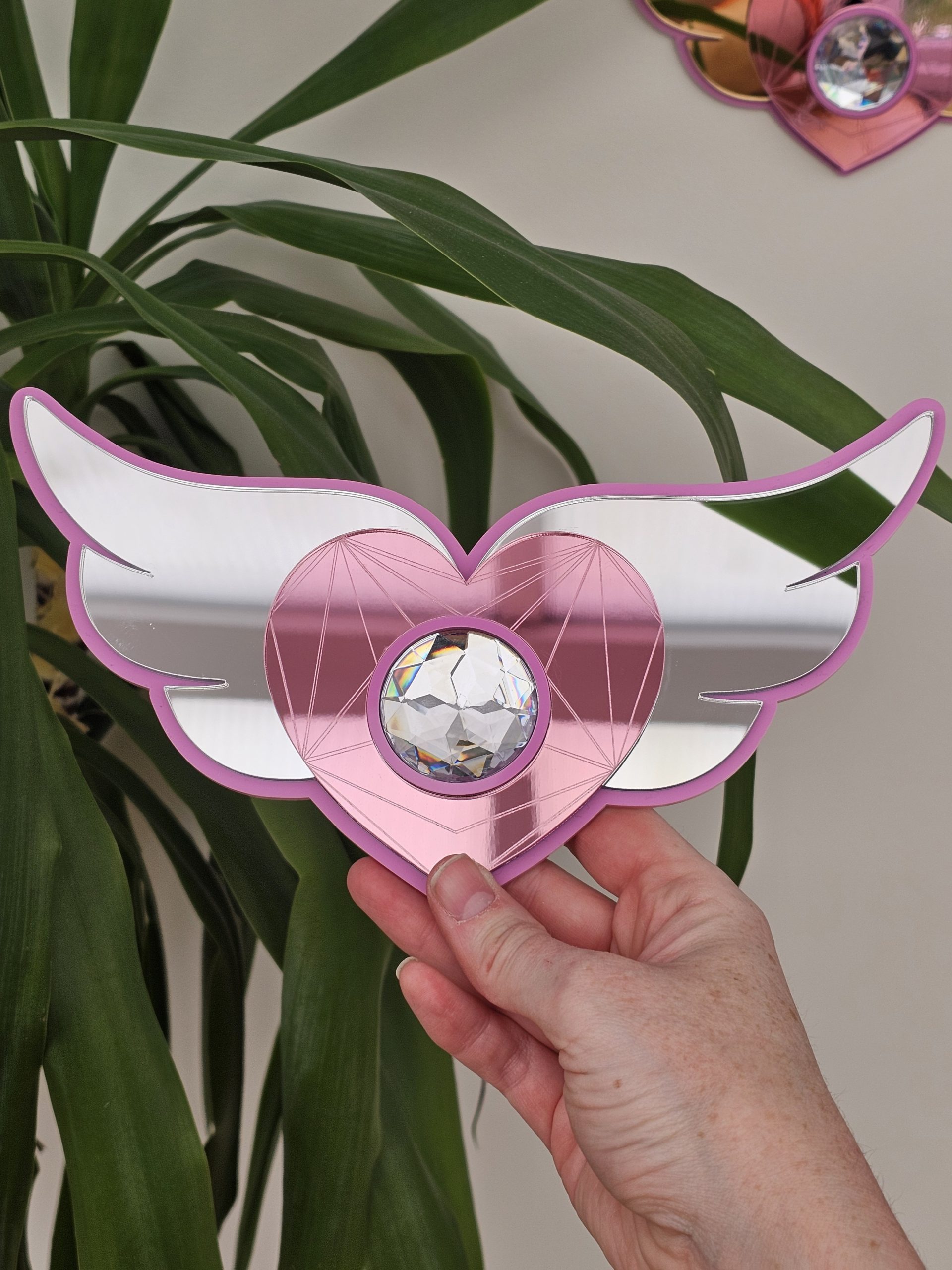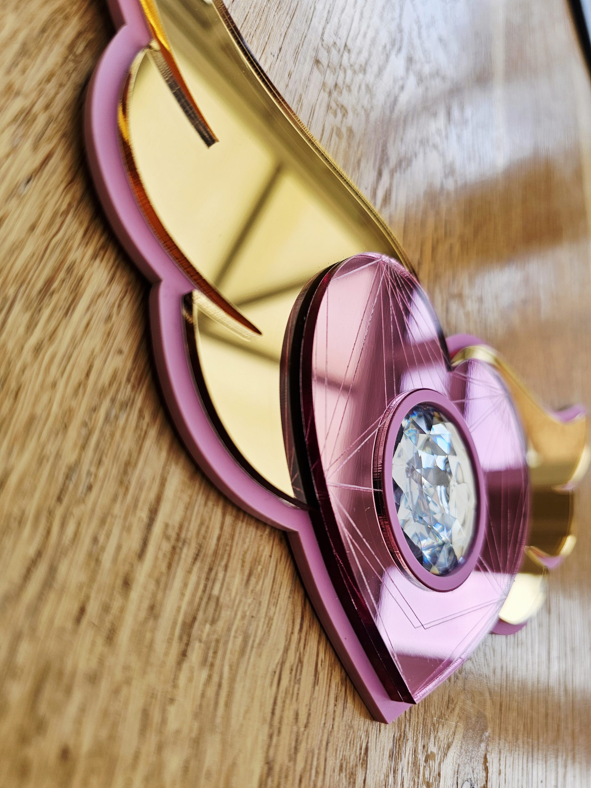 3mm thick pink acrylic backing, layered with 3mm thick gold or silver wings, pink acrylic mirror heart and resin crystal rhinestone.