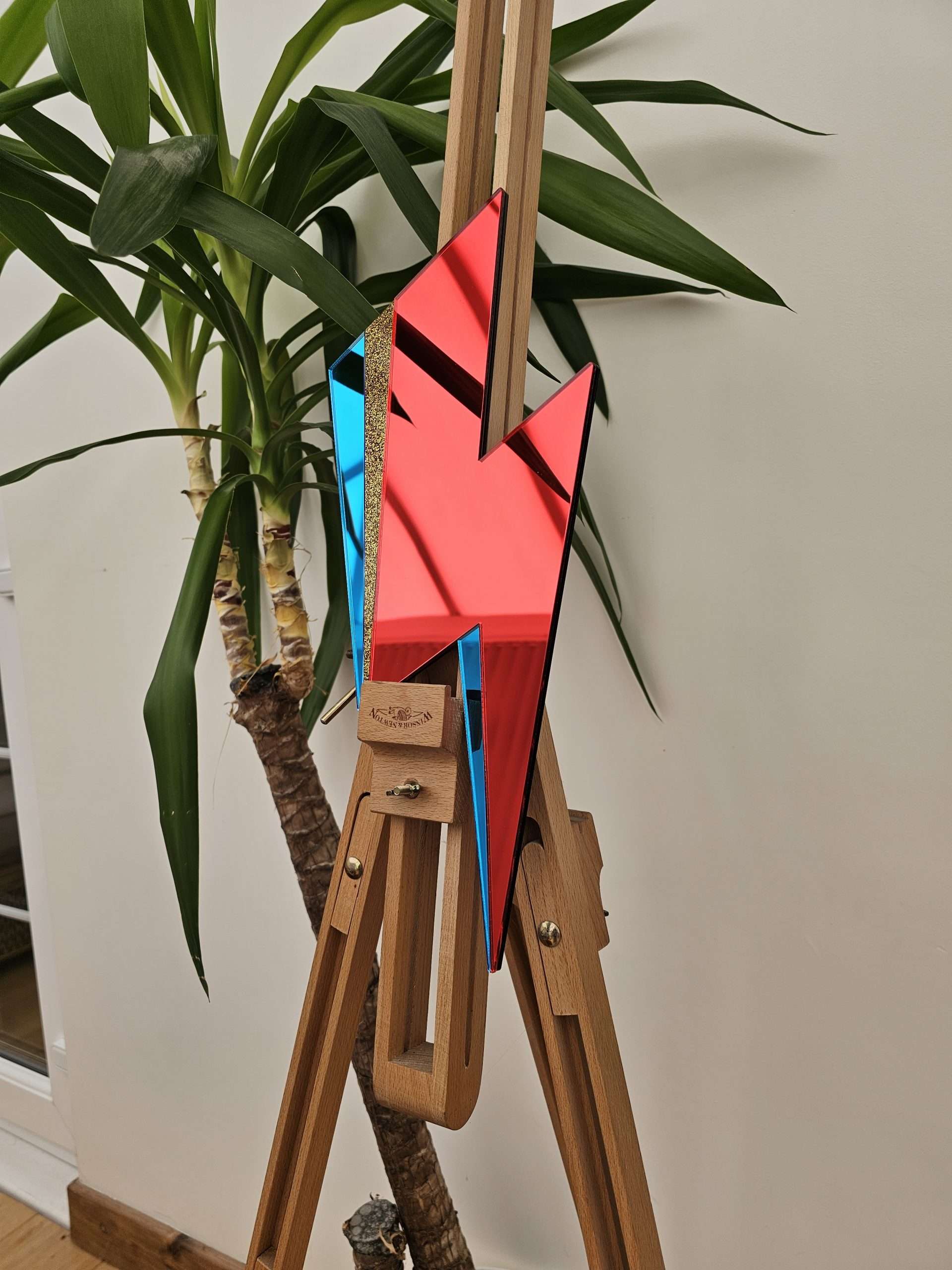 Made with a 3mm thick black gloss acrylic backing, layered with 3mm red and blue mirror acrylic and a flash of gold glitter.
