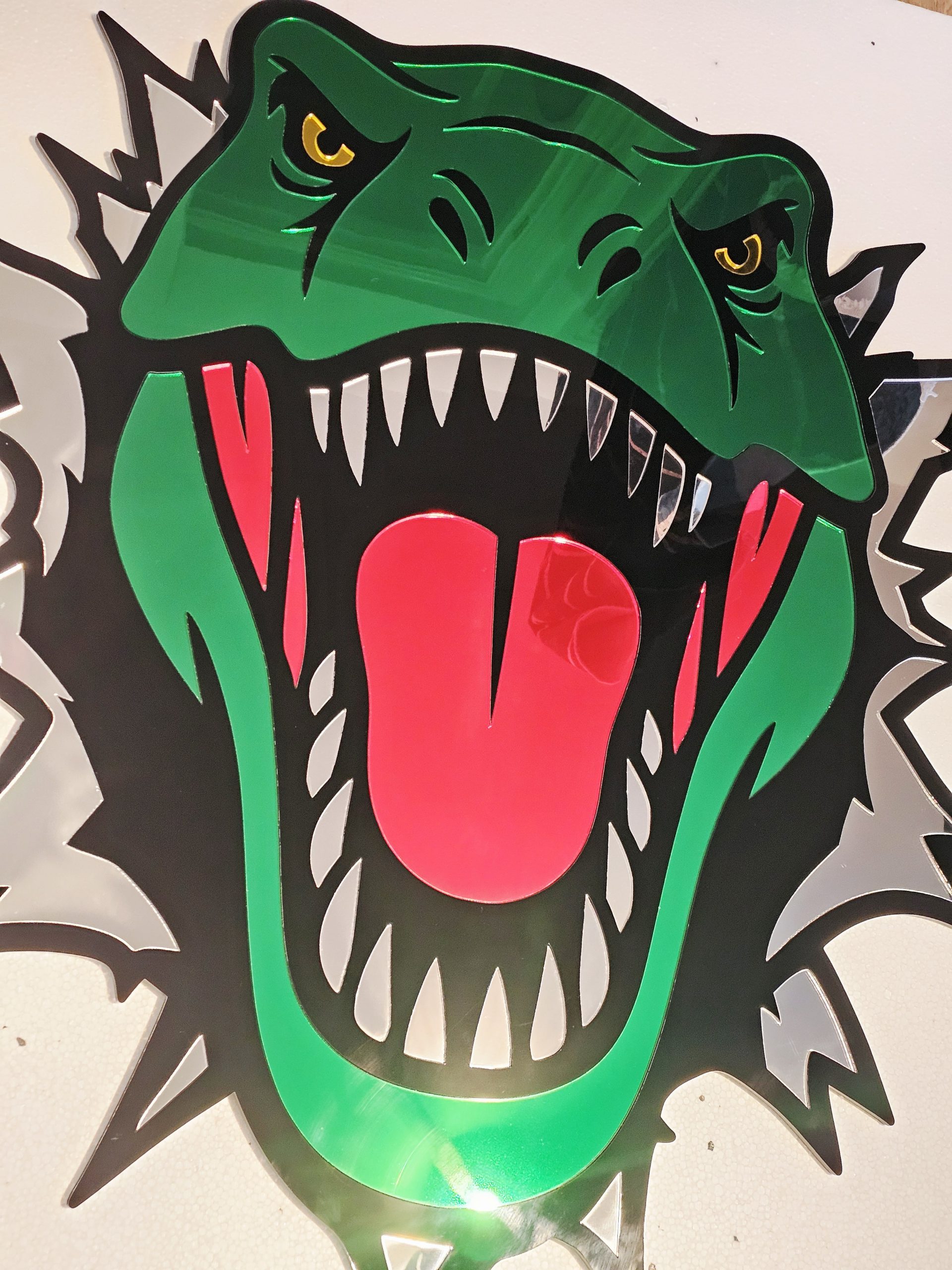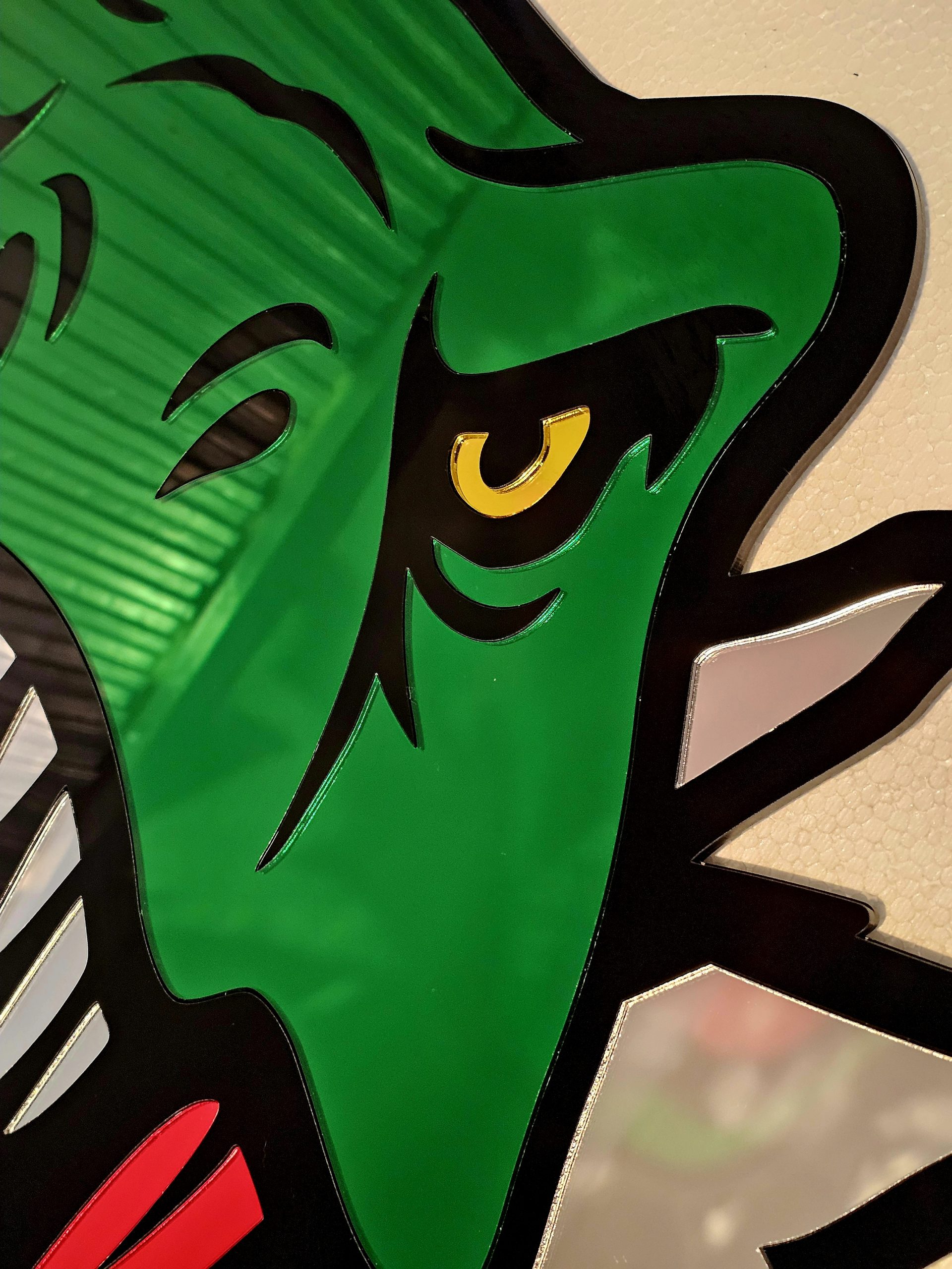 Made with a 3mm black gloss acrylic backing, layered with 3mm thick black gloss outline, inlaid with 3mm thick green, red, yellow and silver mirror.
